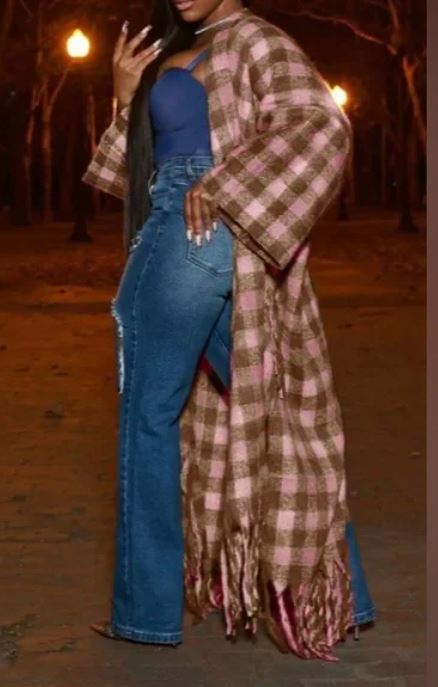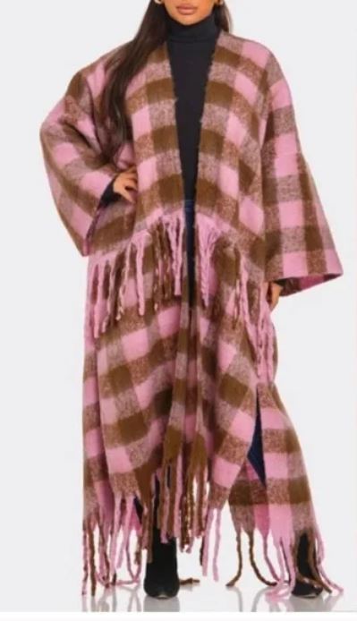 Indulge in the cozy elegance of this statement cardigan. This cardigan is the epitome of effortless sophistication Crafted from a soft brushed wool/polyester blend that mimics the luxurious feel of mohair, it boasts a captivating fuzzy texture and a vibrant, eye-catching print. There will be slight 'fuzz' shading due to the this is purposeful and does not take away from the beautiful cardigan The open front, side slits, and playful twisted tassels create a relaxed yet refined silhouette