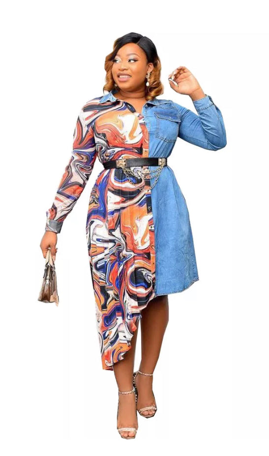 Embrace a touch of playful sophistication with our Chiffon & Denim High-Low Dress. This eye-catching dress features a unique blend of textures, combining the lightness of chiffon with the casual cool of denim. The trendy high-low hem creates a flattering silhouette and adds a touch of drama, while the button-down front allows you to adjust the neckline to your liking. A stylish belt is included to cinch your waist and complete the look. This dress is exclusively available in Orange/Denim. (The Yellow/Denim image is displayed to showcase the dress's design and fit without the belt; this color is not available for purchase).