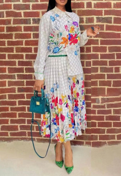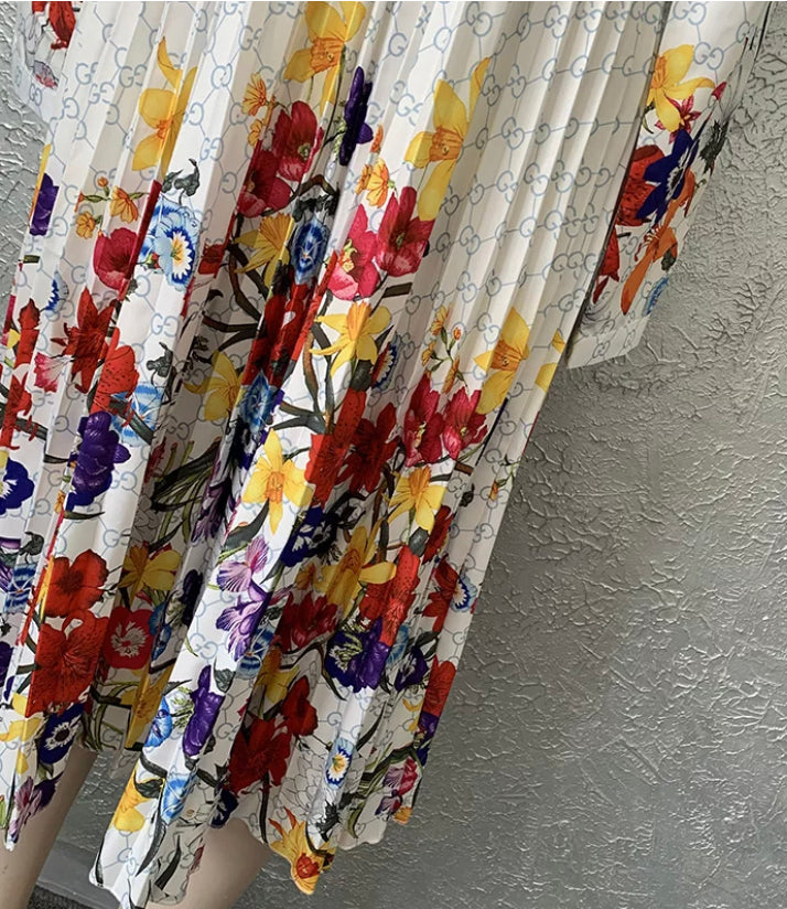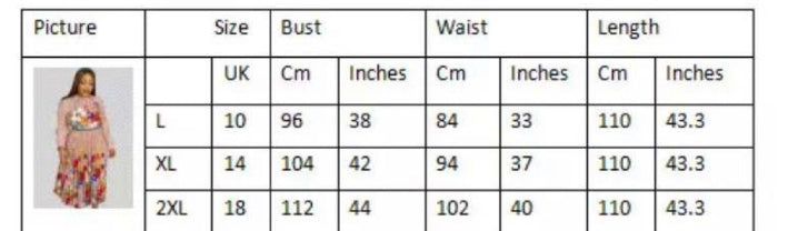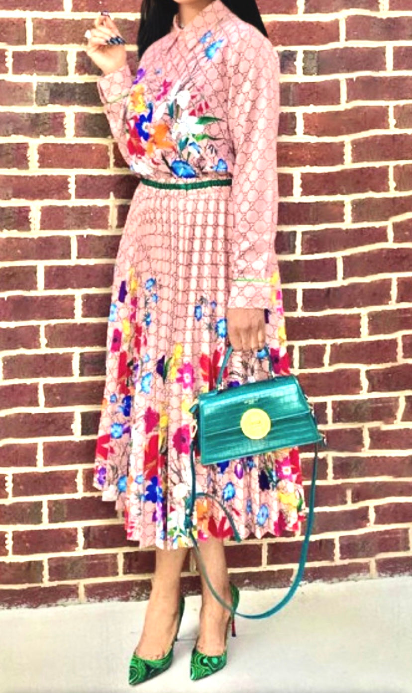 Inspired Dress w/attached green accent around waist which enhances the vibrant colors of the dress