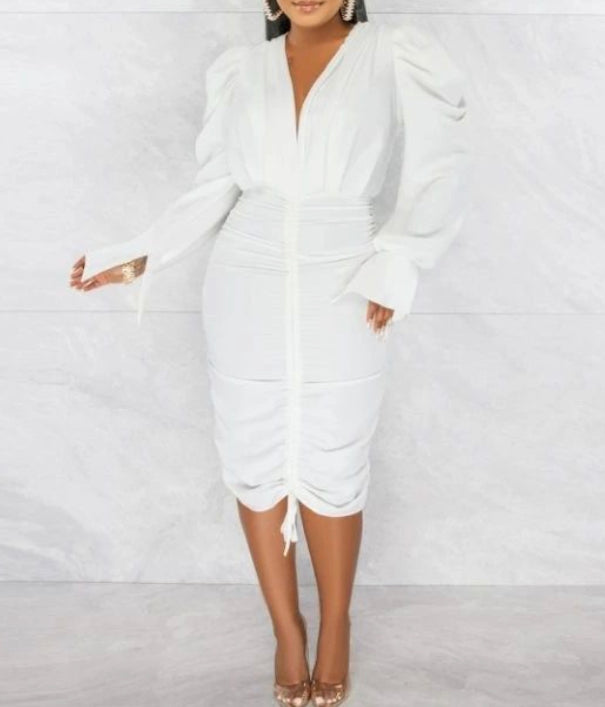 Embrace effortless glamour in our Watch Me Ruched Dress. This captivating dress is designed to make you feel your best, featuring a deep V-neckline that adds a touch of drama, and statement long sleeves that radiate sophisticated style. The artfully placed ruching on both the front and back sculpts and defines your figure, creating a truly show-stopping silhouette. Crafted from a luxurious fabric, this dress provides both comfort and support, ensuring you look and feel incredible all night long. The pristine white hue adds a touch of timeless elegance. Perfect for cocktail parties, weddings, and any occasion where you want to make a lasting impression.