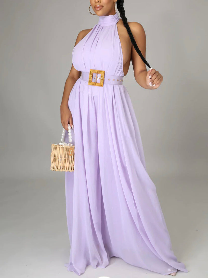 Make a statement in our Mariah Wide Leg Halter Jumpsuit. This captivating jumpsuit is designed to turn heads, featuring a sophisticated halter neckline that highlights your shoulders and elongates your silhouette. The dramatic wide legs create a flowing, elegant look that's perfect for any occasion. Crafted from luxurious 100% rayon that drapes beautifully, and lined with smooth 100% polyester for added comfort, this jumpsuit feels as good as it looks. The delicate lilac color adds a touch of romance. Style it with your favorite belt to create a look that's uniquely yours. (Belt not included). Machine wash cold. Imported.
